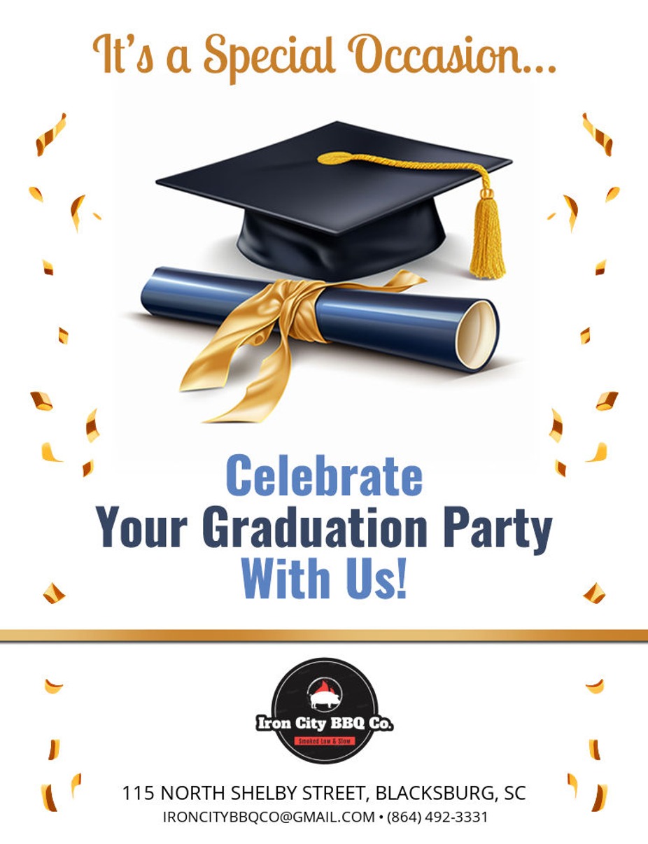 Congratulations to the graduating classes!! Take the stress of food out on us! Let us do all the cooking so you can enjoy your graduate!
